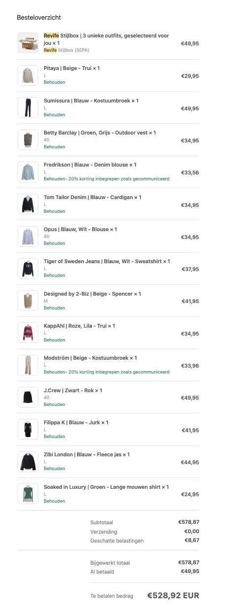 Een paar weken later kwam ineens een mail waarin stond dat er €528,92 afgeschreven zou worden... Voor de alle items die ik had gehouden. Whoops. Ik kreeg heel netjes een overzicht van wat elk item koste.